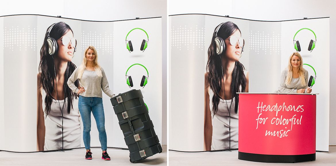 EMC Expo levert ook flexibele achterwanden. Ideaal voor de beperktere standruimtes. De achterwanden zijn eenvoudig zelf op te zetten en te gebruiken in veel variaties: als achterwand of als losse elementen. De elementen zijn magnetisch aan elkaar te bevestigen waardoor er verschillende volgordes gemaakt kunnen worden. Hierdoor creëer je voor elke beurs de perfecte boodschap met de juiste sfeer.